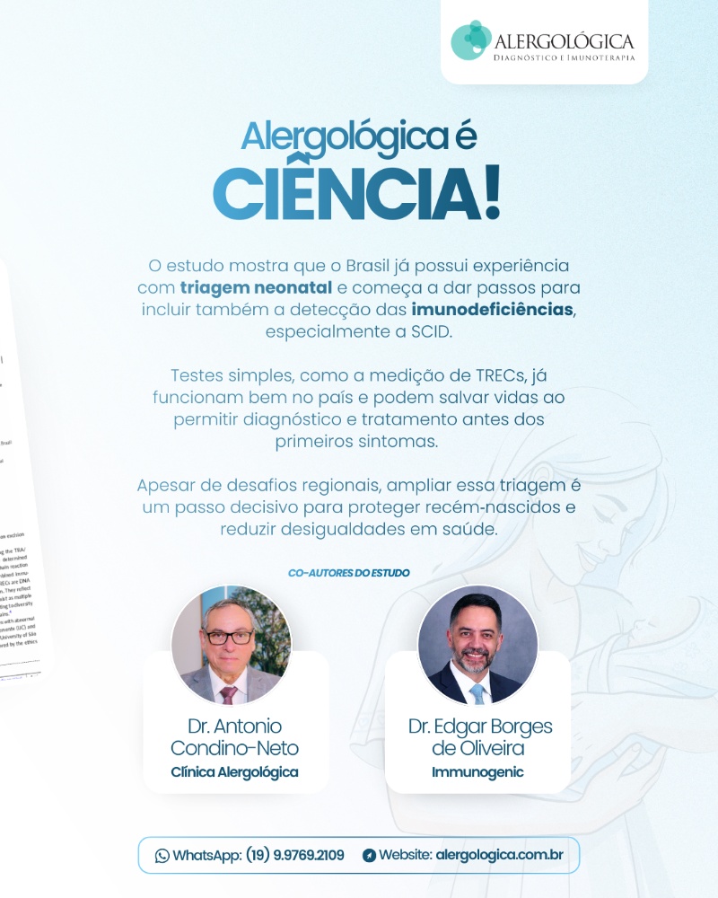 O trabalho – escrito em co-autoria com o dr. Antonio Condino-Neto, diretor da Alergológica, e dr. Edgar Borges, da Immunogenic – analisa o cenário brasileiro e apresenta evidências claras de que ampliar o painel de triagem neonatal para incluir imunodeficiências graves — especialmente a Imunodeficiência Combinada Grave (SCID) — é uma necessidade urgente e que traria inúmeros benefícios à saúde da população.
